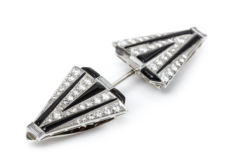 An Art Deco Platinum, White Gold, Diamond and Onyx Convertible Dress Clips/Jabot,