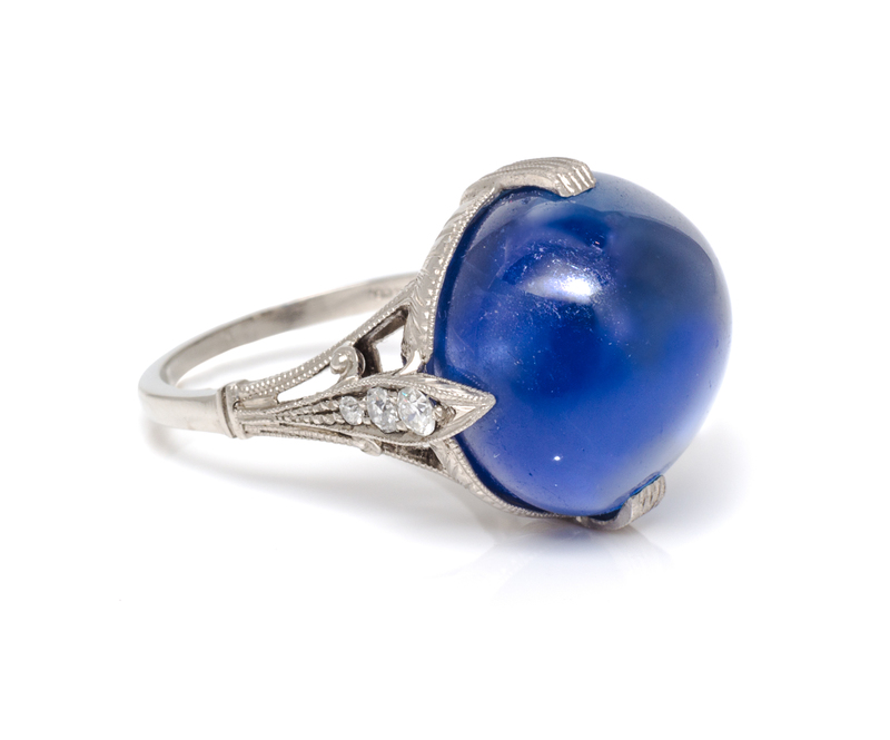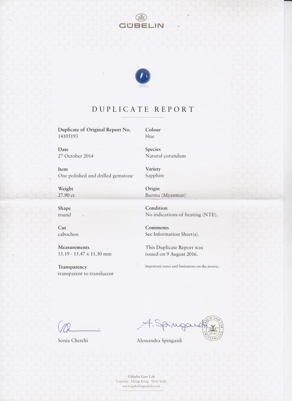 containing one round double cabochon cut sapphire measuring approximately 15.26 x 15.24 x 11.42 mm and weighing approximately 27.90 carats set within an intricately hand engraved basket setting with claw prongs at the compass points and accented with six old European and transitional brilliant cut diamonds weighing approximately 0.17 carat total.Stamp: NOBLE & CO. PT.Accompanied by a Gubelin Gem Laboratory sapphire identification and origin certificate number 14105193, dated October 27, 2014, stating Species: Natural Corundum, Variety: Sapphire, Origin: Burma (Myanmar), Enhancement: No indications of heating.