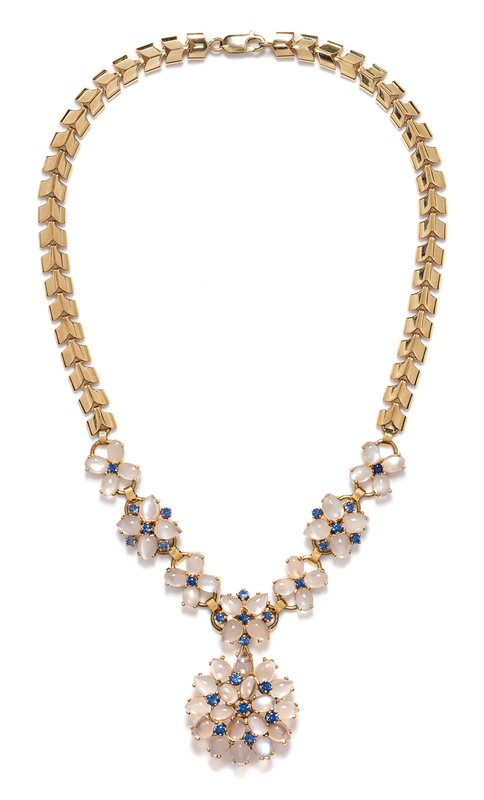 A Retro Yellow Gold, Moonstone, and Sapphire Convertible Necklace, Wordley, Allsopp & Bliss,