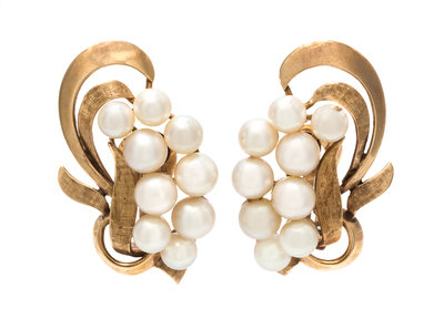 A Pair of Yellow Gold and Cultured Pearl Earclips,
