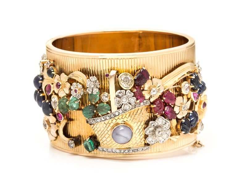 consisting of a fluted bracelet base measuring approximately 40.00 mm wide accented with a flower basket motif containing two oval old mine cut diamond weighing approximately 0.99 carat total, one pear shape old mine cut diamond weighing approximately 0.36 carat, numerous old mine and round single cut diamonds weighing approximately 3.13 carats total, one round cabochon cut star sapphire measuring approximately 7.50 mm in diameter, five oval cabochon cut sapphires weighing approximately 5.19 carats total, four carved sapphires, six carved emeralds, two oval mixed cut rubies weighing approximately 0.45 carat total, six carved rubies, and seven round cabochon and mixed cut rubies.Stamp: 14K.