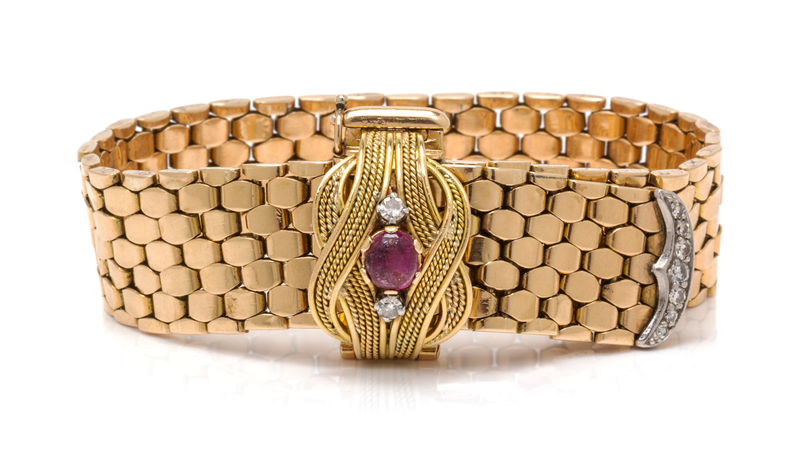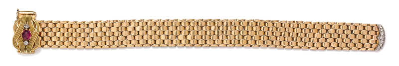 A Retro Platinum, Gold, Ruby and Diamond Belt Bracelet,