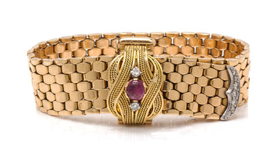 consisting of a rose gold brick link bracelet, the platinum topped terminal and yellow gold knot motif buckle clasp containing nine round single cut diamonds weighing approximately 0.25 carat total and one oval cabochon cut ruby measuring approximately 6.11 x 5.50 mm.