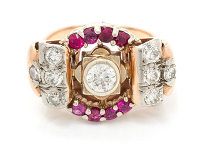A Retro Rose Gold, Platinum, Ruby and Diamond Ring,