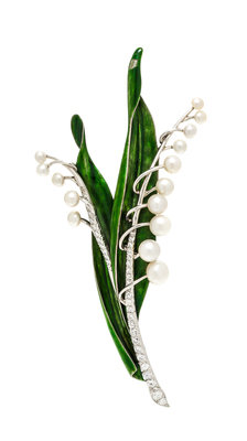 A Platinum, Cultured Pearl, Diamond and Enamel Lily-of-the-Valley Brooch, Udall and Ballou,