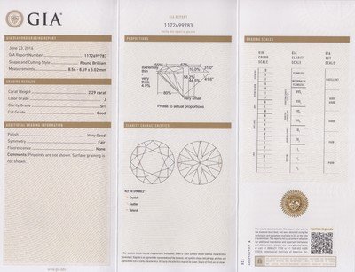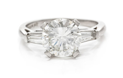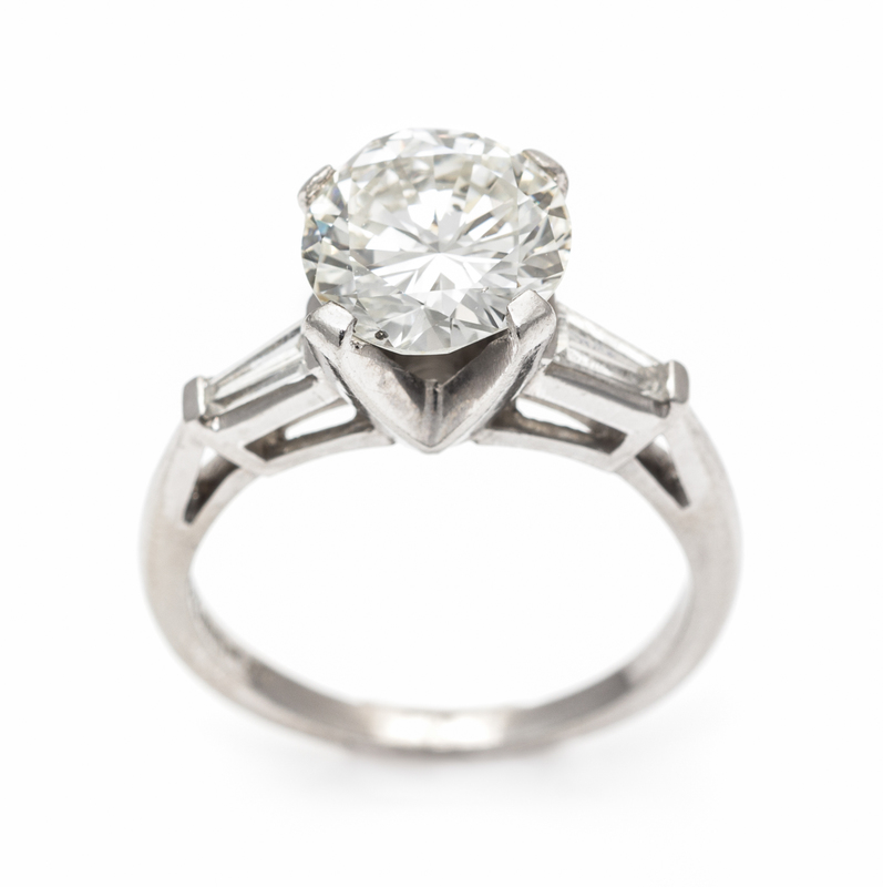 containing a round brilliant cut diamond weighing approximately 2.29 carats and two tapered baguette cut diamonds weighing approximately 0.30 carat total.Stamp: 10% IRID PLAT.Accompanied by a Gemological Institute of America diamond grading certificate number 1172699783, dated June 23, 2016, stating Color: J, Clarity: SI1, Cut: Good, Polish: Very Good, Symmetry: Fair, Fluorescence: None.