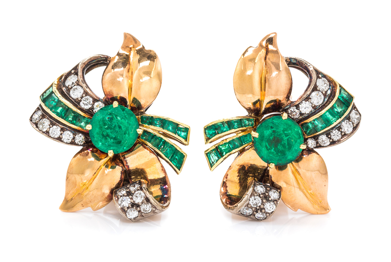 A Pair of Retro Yellow Gold, Emerald and Diamond Earclips,