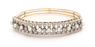 in an openwork design consisting of a white gold top section containing 10 pearls measuring approximately 4.00 mm in diameter and 47 round brilliant cut diamonds weighing approximately 2.60 carats total above the yellow gold hinged bangle base. Stamp: 14k.