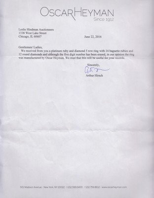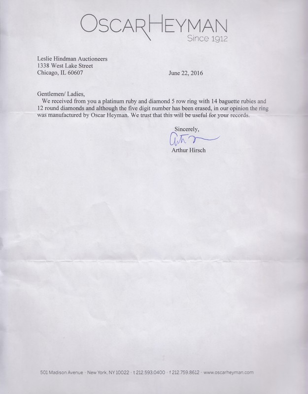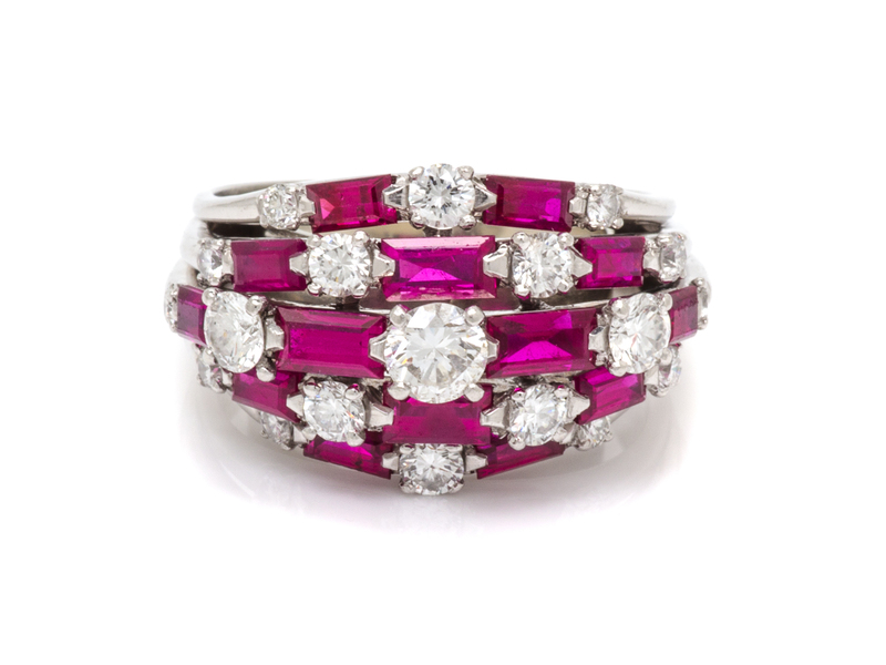 in an openwork five row design, containing 19 round brilliant cut diamonds weighing approximately 1.07 carats total set alternating with 14 rectangular step cut rubies weighing approximately 2.36 carats total.Accompanied by a letter from Oscar Heyman dated June 22, 2016, stating that though the five digit stamp has been obscured, it is the their opinion that the ring was manufactured by Oscar Heyman.