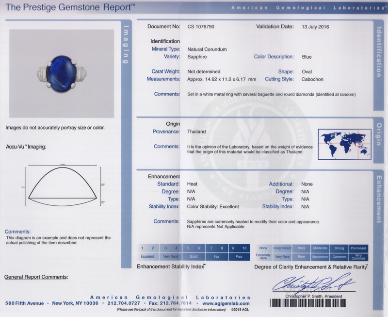 containing one oval cabochon cut sapphire measuring approximately 14.62 x 11.20 x 6.17 mm, four baguette cut diamonds weighing approximately 0.36 carat total, and two transitional brilliant cut diamonds weighing approximately 0.09 carat total.Stamp: 10%IRID. PLATINUM.Accompanied by an American Gemological Laboratories alexandrite identification and origin report number CS 1076790, dated 13 July 2016, stating Mineral Type: Natural Corundum, Variety: Sapphire, Measurements: 14.62 x 11.2 x 6.17 mm, Origin Provenance: Thailand.