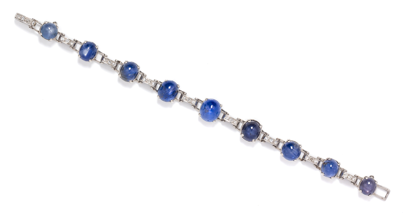 containing nine oval cabochon cut star sapphires weighing approximately 37.43 carats total and 27 round single cut diamonds weighing approximately 0.68 carat total.