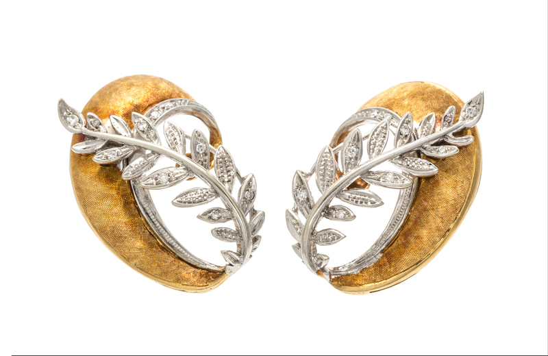 A Pair of 18 Karat Yellow Gold, Platinum, and Diamond Earclips,