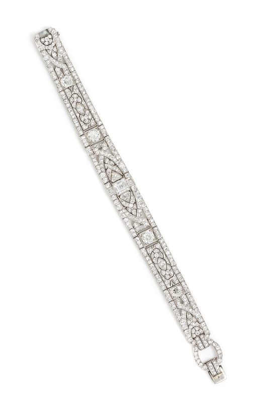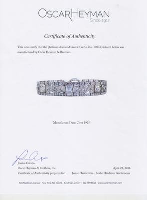 retailed by Juergens & Anderson, Chicago, in 1925, the bracelet in an intricate openwork geometric link design with millegrain edgework, containing one square step cut diamond weighing approximately 1.18 carat, two old European cut diamonds weighing approximately 1.85 carats total, two antique cushion shape brilliant cut diamonds weighing approximately 1.56 carats total, approximately 314 old European and round single cut diamonds weighing approximately 6.58 carats total, and eight antique marquise, shield shape and baguette cut diamonds weighing approximately 1.06 carats total.Stamp: 10804.Hand engraved: P31035.Accompanied by an Oscar Heyman Brothers certificate of authenticity, dated April 22, 2016, stating the platinum diamond bracelet, serial No. 10804, was manufactured by Oscar Heyman & Brothers. Manufacture Date: Circa 1925.