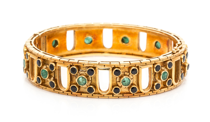 An 18 Karat Yellow Gold, Sapphire and Emerald Bangle Bracelet, Lalaounis,