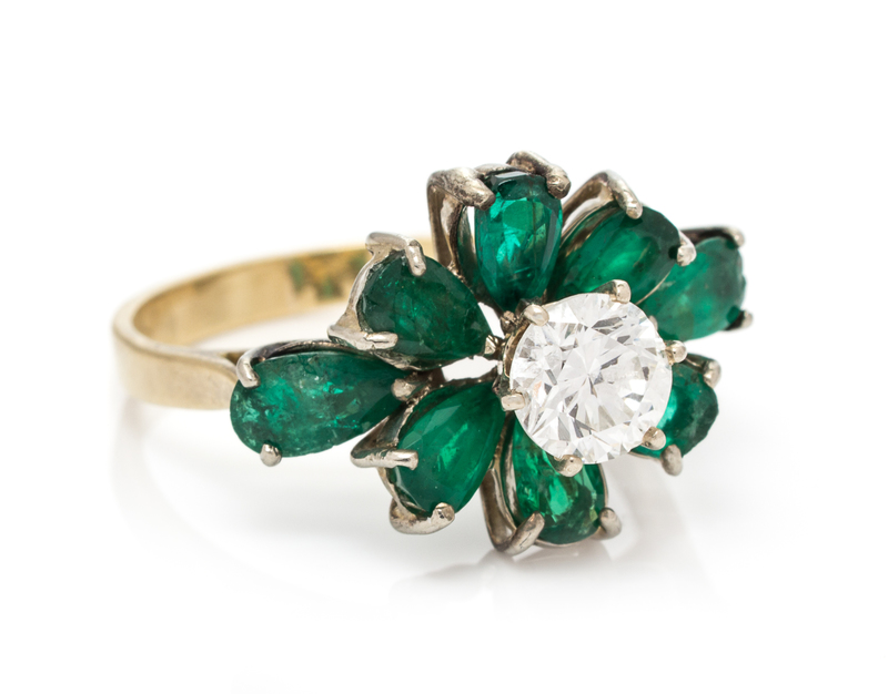 containing one round brilliant cut diamond weighing approximately 0.73 carat and eight pear shape emeralds weighing approximately 2.08 carats total. Stamp: Kt18.