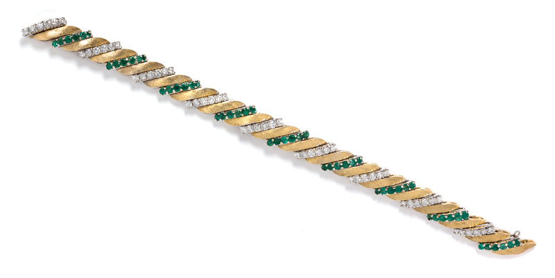 An 18 Karat Yellow Gold, Platinum, Emerald and Diamond Bracelet,