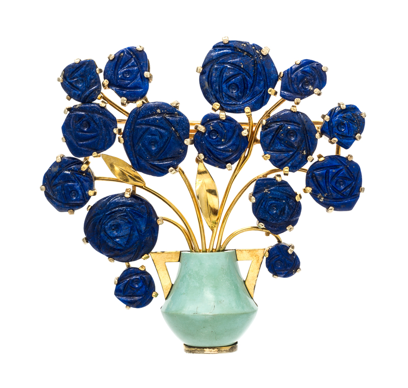 in a flower basket motif, the blossoms composed of 15 carved lapis lazuli plaques measuring approximately 6.00-13.00 mm in diameter and a carved turquoise vase shape plaque measuring approximately 16.85 x 16.50 mm.Stamp: (French assay mark) G B(maker's mark).