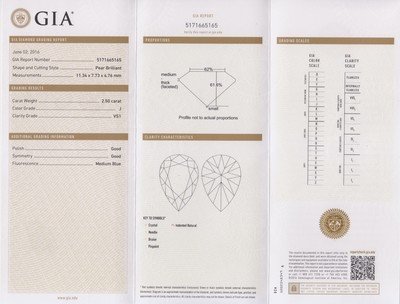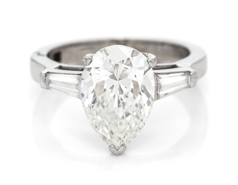 containing one pear shape diamond weighing approximately 2.50 carats and two tapered baguette cut diamonds weighing approximately 0.46 carat total.Accompanied by a Gemological Institute of America diamond grading certificate number 5171665465, dated June 2, 2016, stating Color: J, Clarity: VS1, Polish: Good, Symmetry: Good, Fluorescence: Medium Blue.