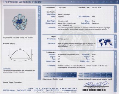 containing nine fancy pear shape mixed cut aquamarine weighing approximately 30.39 carats total, five cabochon cut sapphires weighing approximately 5.73 carats total, and 66 round brilliant and single cut diamonds weighing approximately 0.76 carat total.Stamp: Julius Cohen.Accompanied by an American Gemological Laboratories sapphire identification certificate number CS 1075961, dated June 16, 2016, stating Mineral Type: Natural Corundum, Variety: Sapphire, Origin: Burma (Myanmar), Enhancement: None, Clarity Enhancement: None.