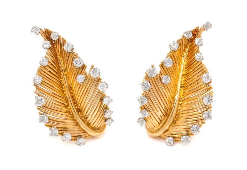 in a textured wirework stylized leaf design, the edges containing 36 round brilliant cut diamonds weighing approximately 1.44 carats total. Stamp: 750 (maker's marks).