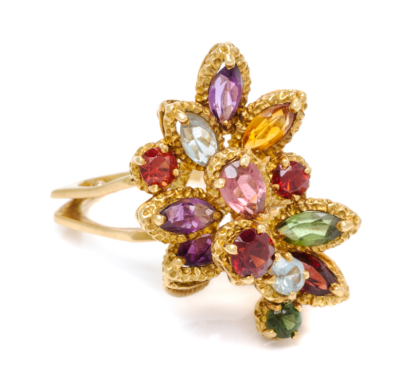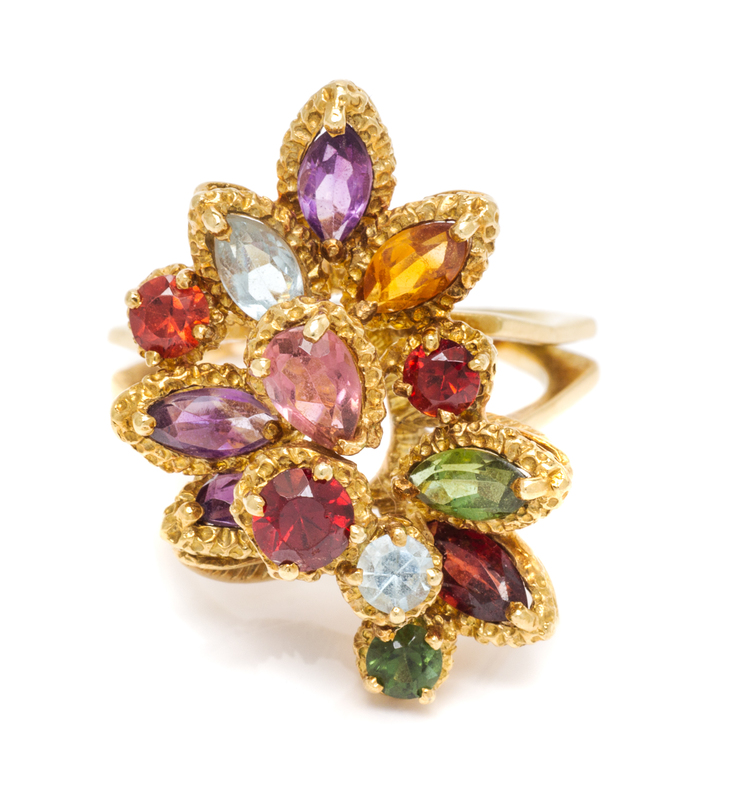 containing assorted stones including garnet, aquamarine, amethyst, citrine, green tourmaline, and pink tourmaline in various shapes and sizes set within a textured openwork cluster.