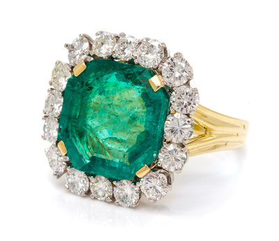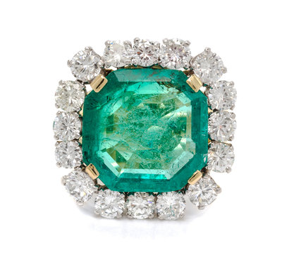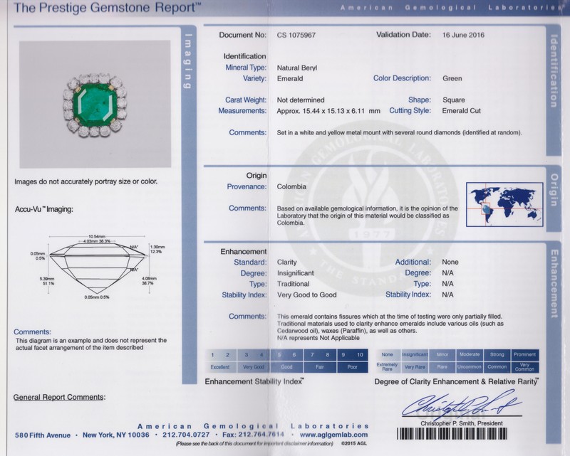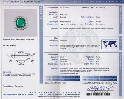 containing one octagonal step cut emerald measuring approximately 15.34 x 15.13 x 6.10 mm and 16 round brilliant cut diamonds weighing approximately 2.97 carats total.Accompanied by an American Gemological Laboratories emerald identification and origin certificate number CS 1075967, dated June 16, 2016, stating Mineral Type: Natural Beryl, Variety: Emerald, Origin: Colombia, Clarity Enhancement: Insignificant, Type: Traditional.