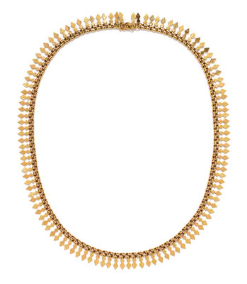 consisting of a double curb link rose gold chain suspending an alternating textured yellow and polished rose gold geometric fringe.Stamp: (Assay mark) (obscured mark).