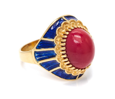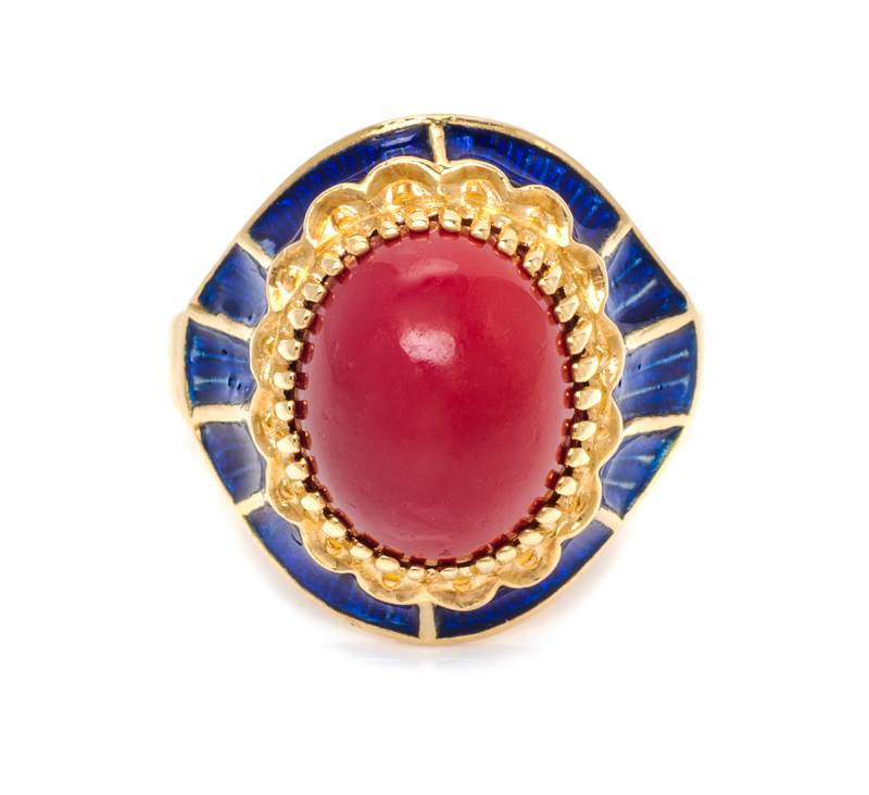 An 18 Karat Yellow Gold, Coral and Enamel Ring, Italian,
