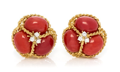 A Pair of 18 Karat Yellow Gold, Coral and Diamond Earclips, Italian,