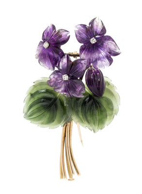 consisting of four carved amethyst flower sections, two carved nephrite jade leaves and three round single cut diamonds weighing approximately 0.07 carat total within an open wirework setting, brooch measures approximately 58.00 x 32.00 mm.Stamp: (Vienna, Austria assay mark).