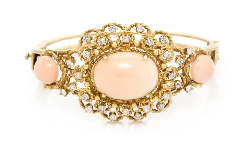 A Yellow Gold, Coral, and Diamond Bangle Bracelet,