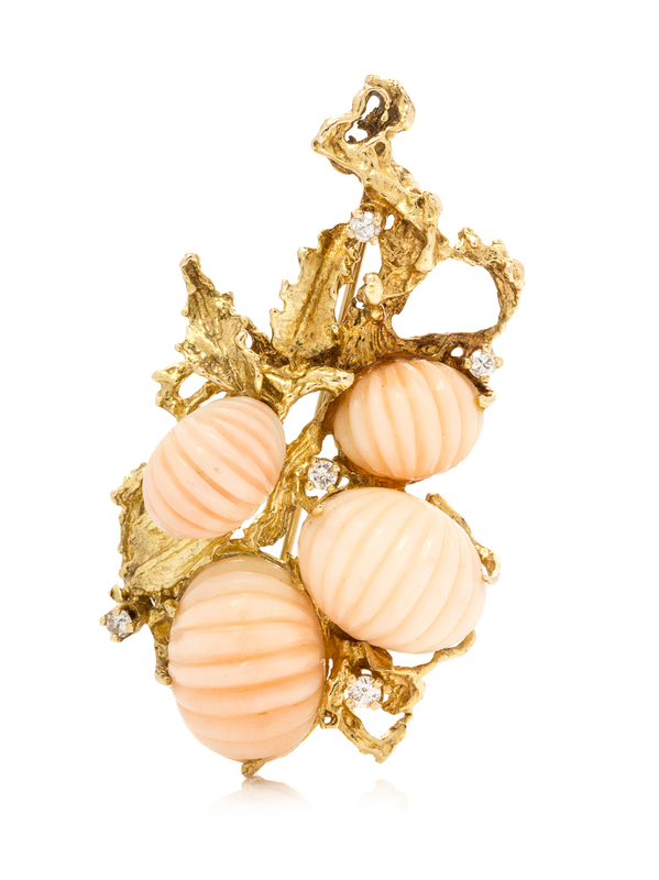 in a stylized textured foliate motif composed of textured leaves and vines, the brooch containing four oval melon form angel skin coral and five round brilliant cut diamonds weighing approximately 0.40 carat total.