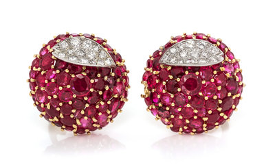 A Pair of 18 Karat Bicolor Gold, Ruby and Diamond Earclips,