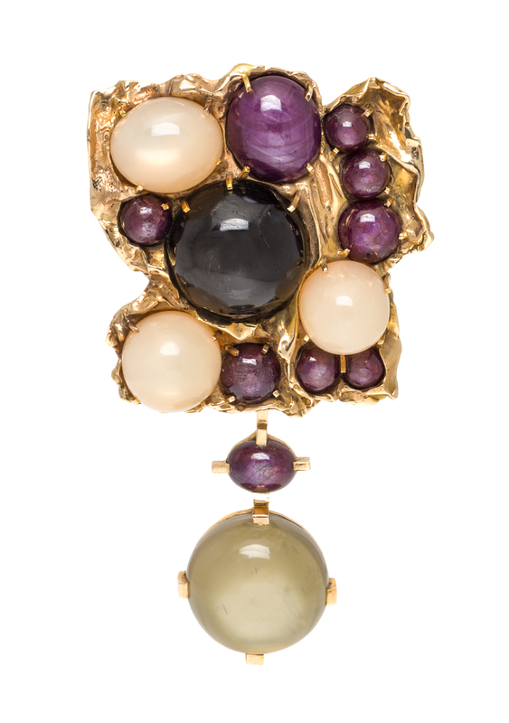 the central plaque containing one round cabochon cut black star sapphire measuring approximately 30.00 mm in diameter, one oval cabochon cut peach moonstone measuring approximately 24.00 x 20.00 mm, two round cabochon cut peach moonstones measuring approximately 20.65-21.00 mm in diameter, one oval cabochon cut star ruby measuring approximately 23.66 x 20.57 mm and seven round cabochon cut star rubies measuring approximately 9.93-12.58 mm in diameter, suspended from the plaque is a removable pendant containing one round cabochon cut cat's eye chrysoberyl measuring approximately 32.00 mm in diameter and one oval cabochon cut star ruby measuring approximately 15.00 x 10.90 mm.Stamp: 14K.