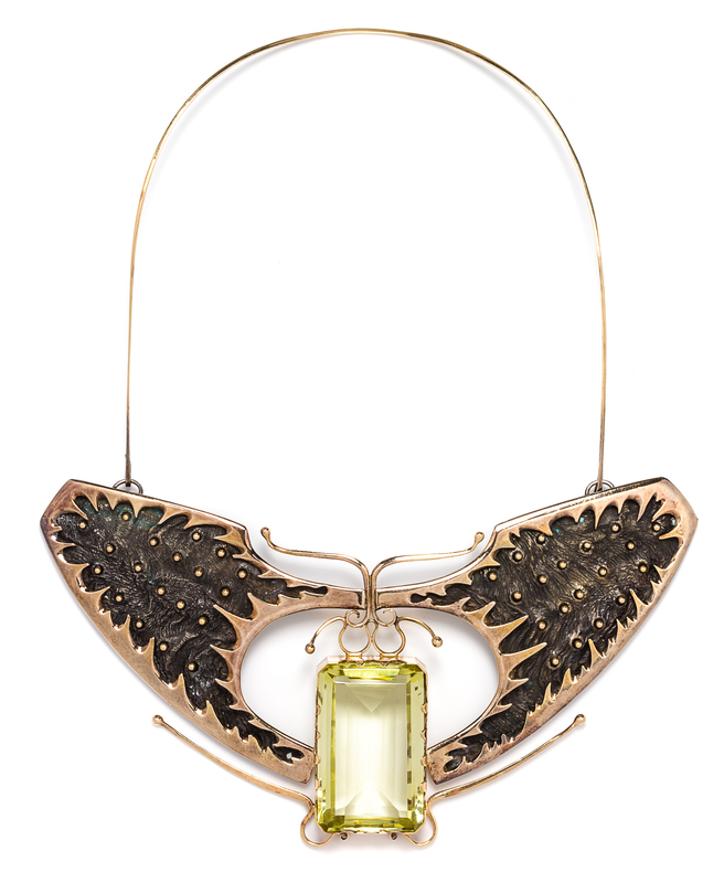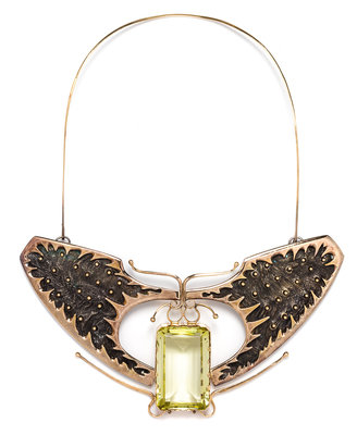 A Silver, Gold and Yellow Quartz Butterfly Motif Collar Necklace,