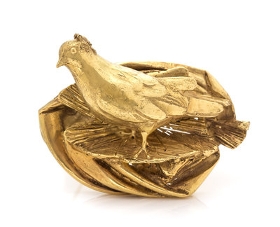 consisting of a sculpted bird within a textured nest.Stamp: 750 MANZU.Hand inscribed: VII-XII.Accompanied by a box signed MANZU.