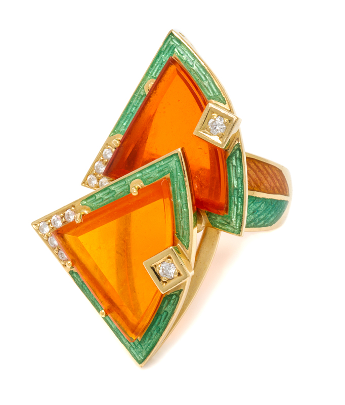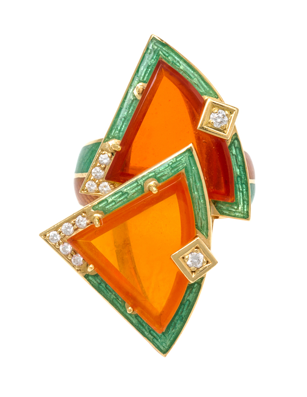 containing two triangular fire opal plaques and 11 round brilliant cut diamonds weighing approximately 0.21 carat total, the ring accented with translucent green and orange enamel accents over textured ground.Stamp: 750 (maker's mark).