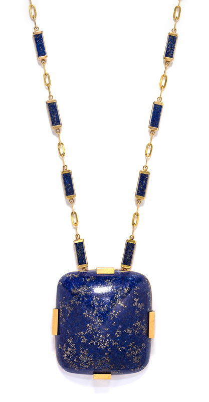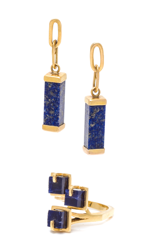 consisting of a yellow gold necklace containing one cushion shape cabochon cut lapis lazuli measuring approximately 75.00 x 70.00 mm suspended from an oval link chain interspersed with 13 rectangular block cut lapis lazuli links, together with a pair of matching earrings containing two rectangular block cut lapis lazuli pendants suspended from oval gold links, and a similar 18 karat yellow sculptural ring containing three square block cut lapis lazuli.Necklace stamp: 585 14K.Earring stamp: 14K.Ring stamp: (partially obscured) 750.