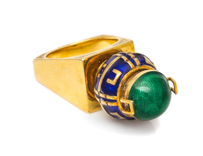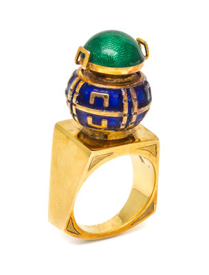 in a modernist Asian motif of stacked geometric forms accented with translucent blue and green enamel textured ground above the polished and textured squared ring base.Stamp: 14K.