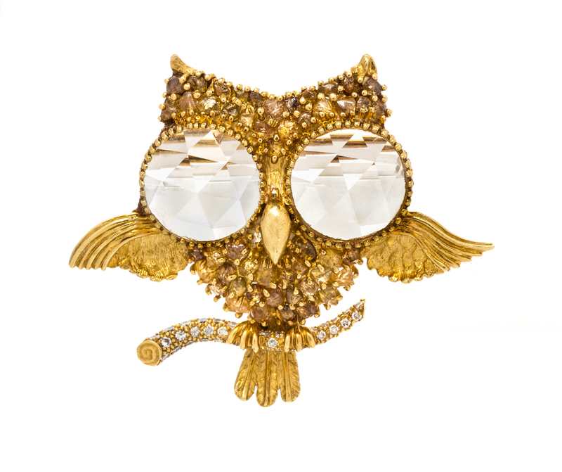 in a whimsical owl motif, containing two rose cut rock crystal eyes measuring approximately 13.45 mm in diameter, the body set with numerous rough yellow diamond crystals (origin of color not tested), fluted and textured wings and tail, perched upon a branch containing 35 round brilliant cut diamonds weighing approximately 0.35 carat total.Stamp: Julius Cohen.