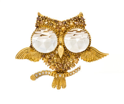 A Yellow Gold, Rock Crystal and Colored Diamond Owl Brooch, Julius Cohen,