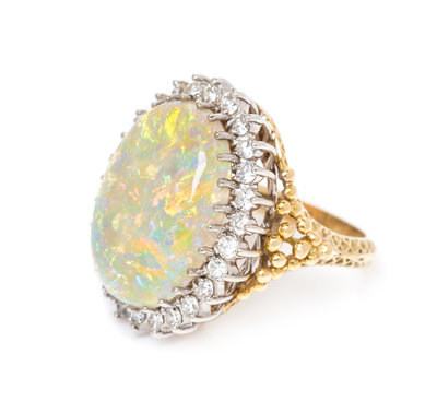in an open wirework setting, containing one oval cabochon cut semi-crystal opal weighing approximately 7.00 carats and 26 round brilliant cut diamonds weighing approximately 0.78 carat total.