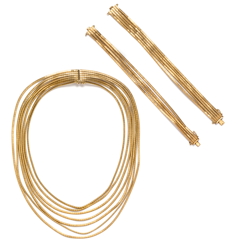 consisting of a seven row necklace and a pair of matching four and five row bracelets composed of brushed finish square links.Stamp: 18K.
