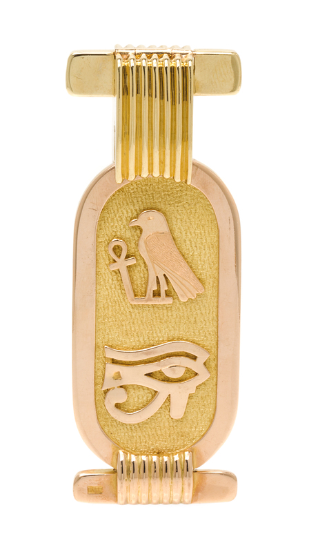 consisting of a rose and yellow gold double sided Egyptian cartouche pendant with removable yellow gold brooch enhancer.Pendant stamp: (Arabic 18 numerals).Enhancer brooch: 18Kt (maker's mark for McTeigue).
