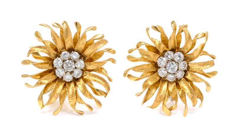 consisting of Florentine and high polish finish twisted petals surrounding the cluster centers containing 16 round brilliant cut diamonds weighing approximately 1.72 carats total.Stamp: 2872 WW.