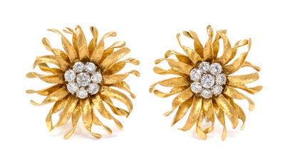 A Pair of Yellow Gold and Diamond Flower Motif Earclips,