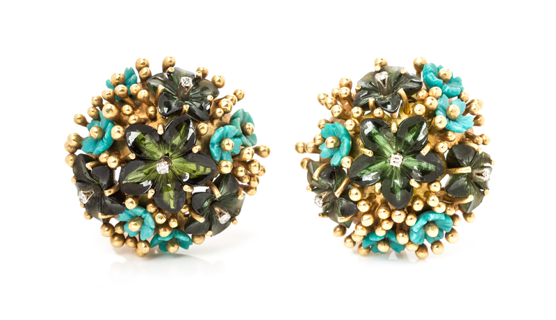 in a domed design with beaded wirework accents containing eight carved green tourmaline flowers, 10 carved turquoise flowers, and eight round single cut diamonds weighing approximately 0.10 carat total, the earclips measuring approximately 26.00 mm in diameter.Stamps: 18K ITALY TIFFANY & CO.