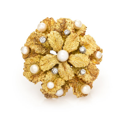 An 18 Karat Yellow Gold, Cultured Pearl and Diamond Brooch, Tiffany & Co.,