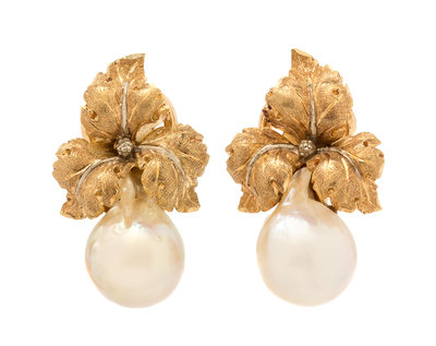 A Pair of 18 Karat Yellow Gold and Cultured Pearl Earclips, Mario Buccellati,