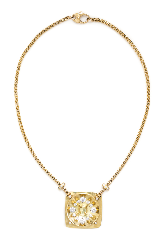 consisting of a central pendant composed of a cushion shape plaque surmounted with a concave design and accented with numerous raised bezel and prong settings suspended from a fancy link chain with two domed accents, the necklace containing four round brilliant cut diamonds weighing approximately 2.20 carats total, and 22 round brilliant cut diamonds weighing approximately 1.47 carats total.Stamp: 18k (hand inscribed maker's mark depicting a script F).